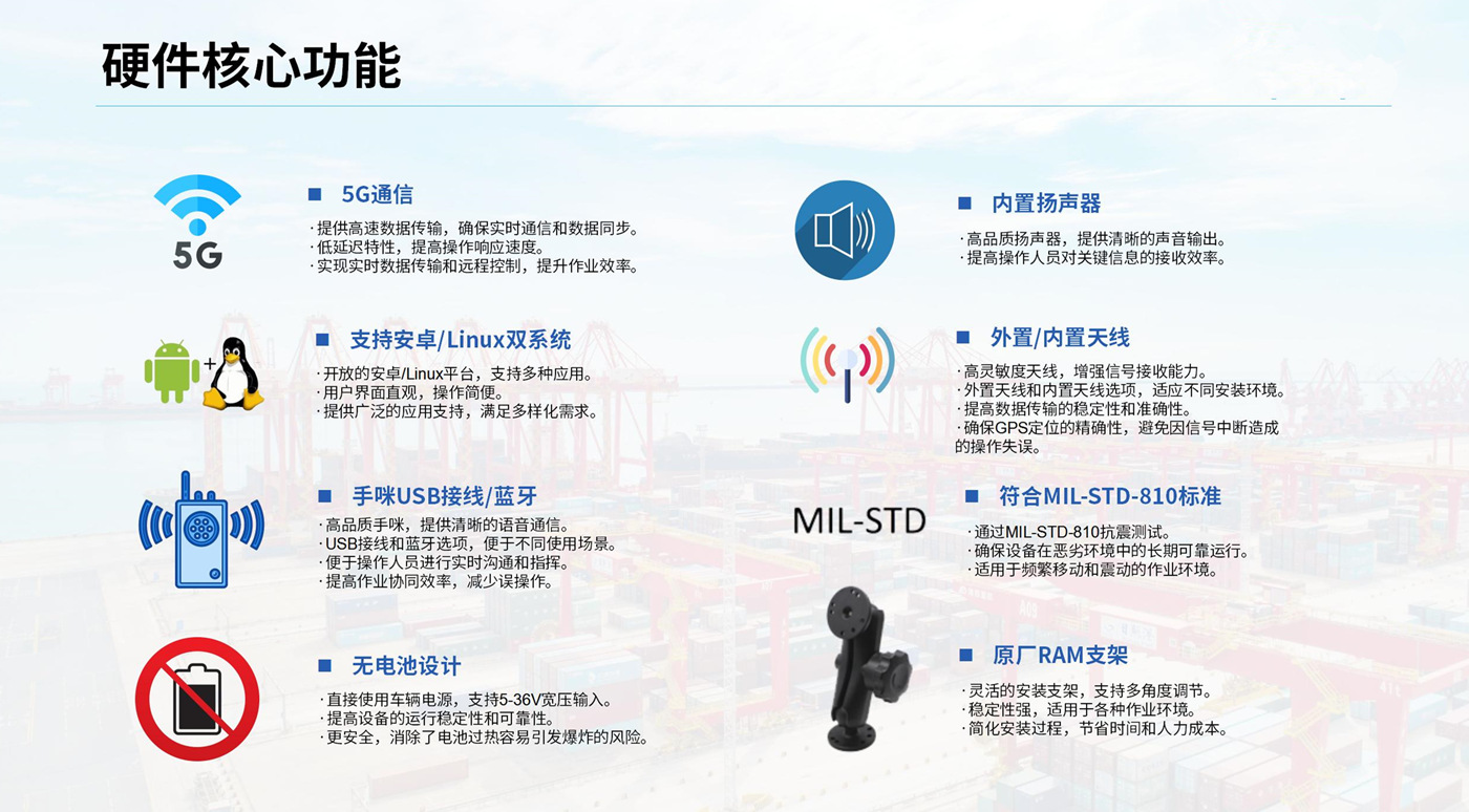 连云港港口作为重要的物流枢纽,面临着提高作业效率、降低运营成本和确保作业安全的挑战。从飞智能提供的智能车载平板,通过先进的5G通信、差分定位技术搭配港口高效的调度系统,旨在提升港口的智能化水平,实现装载机的自动化管理。