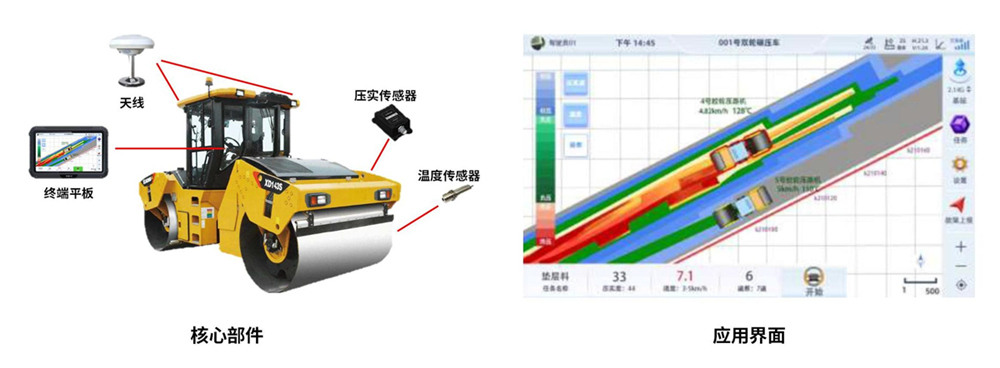 系统采用北斗高精度实时定位技术和压实传感器监测技术,通过软件的实时处理获知压路机钢轮准确的三维位置及钢轮的震动量,以数字化、图像化的方式实时记录显示压路机行进方向、行进速度、振动压实值、碾压遍数、填筑厚度等信息,从而引导施工。